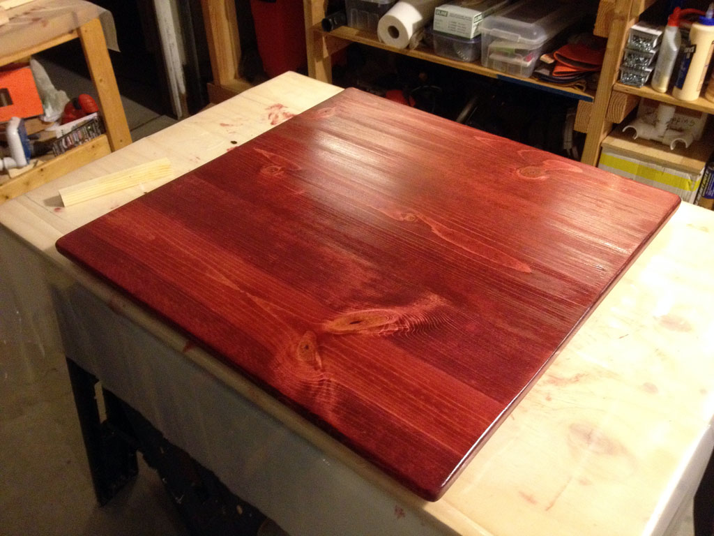 Now that the Hall Tree is done I could start working on the kid’s table again.  I stained it on Saturday to match the Hall Tree since they will be in the same area.  The stain came out a little blotchy in some areas.  The directions on the stain say that it does not need any conditioner applied first and I had great results with all my tests on the Hall Tree.  I bought the wood for the hall tree at Home Depot and the wood for the table was purchased at Lowes.  I also sanded the table a couple of weeks ago.  I’m thinking that I should have re-sanded it the same day to open the pores a little more.  I also should have found some scraps from the Lowes wood to test the stain on.  I put one coat of poly on the bottom on the tabletop, let it dry for an hour, and then flipped it over and put a coat on the top.  I am going to give it a light sanding tonight and then apply another coat on both sides.  My goal is to have 2 coats on the bottom of the tabletop and the legs and frame and then 5 coats on the tabletop itself.