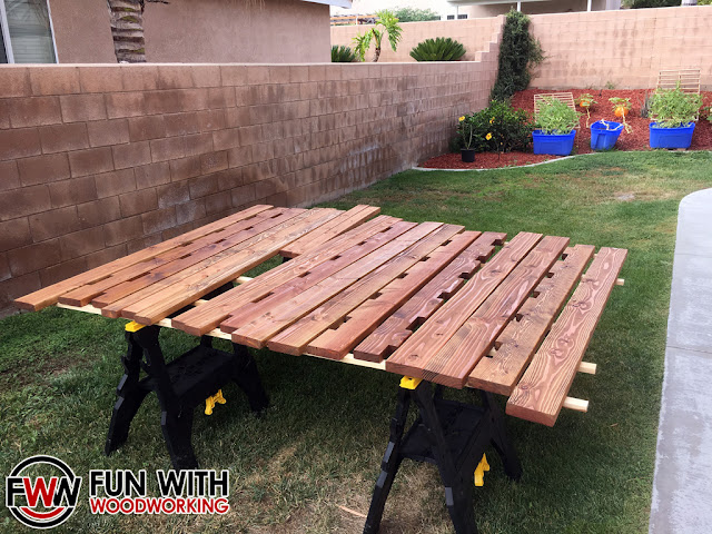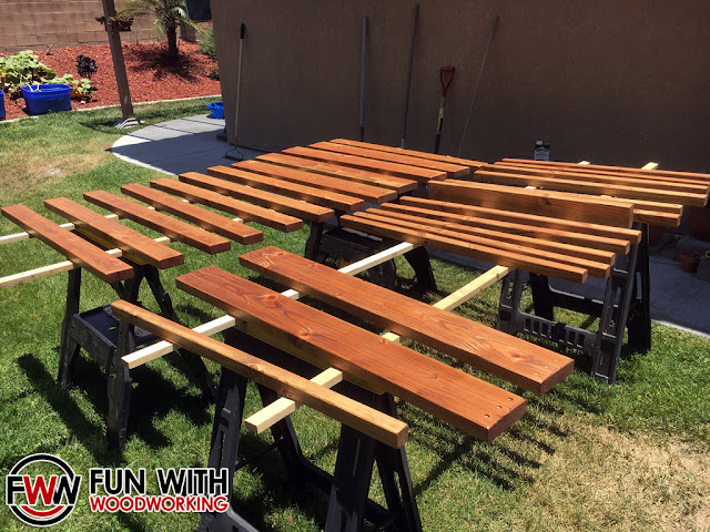 I started this project early last year and I never seem to have the time needed to complete the various stages. I finally got some time in April to get all the pieces outside and get them sanded down to 120 grit with my random orbit sander. It took about 4 hours total to get them all smooth enough for stain and then polyurethane.
