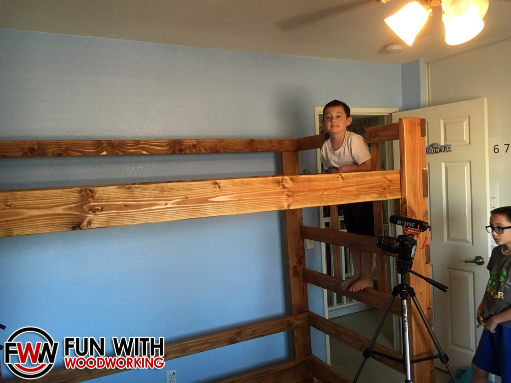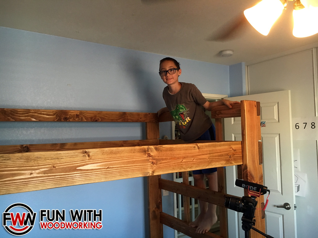 The over all assembly time for the first part of the bed took about 5 hours but that included showing my boys how it went together and answering all of their questions as to why we were doing the way that we did. If everything goes according to plan I will be adding the second half the bed this weekend. I also plan on lowering the top bunk about 3″ before I add that second bed. The mattress was a little thicker than I expected so the top rail isn’t as effective as I like. I will adjust the height of the second bed to match the first as I assemble it.