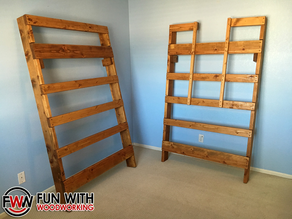 I leaned the non ladder side up against the wall on the left and then clamped some temporary supports to the one on the right. I was then able to lift the stretchers for the mattress into place and get them screwed in.