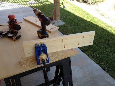 Pocket holes, pocket holes, pocket holes…..  I drilled like 40 pocket holes for the hall tree today.  This is the first project that has required this many and boy do they get boring.  Then I spent an hour sanding. All people in the videos that I watch always comment on how most of my woodworking time will be spent sanding and I am starting to understand it now.  If everything goes according to plan then assembly will start on Sunday.  I sanded the heck out of the 3 boards that I glued poorly.  I got rid of the ridge but now it’s kinda wavy and almost bowed looking.  If it was going somewhere that it would be seen I would go buy some more wood and redo it.  But seeing as how I am on an artificial time limit I am going to leave it as is.