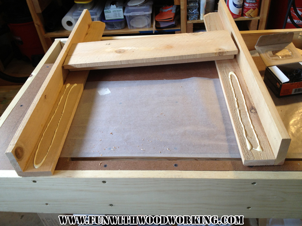 I took another board and cut it down to size to tightly surround the lid. I also ripped them down to 2 1/2″. I glued, nailed, and clamped the pieces over night.