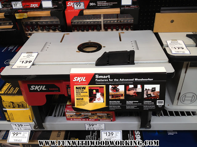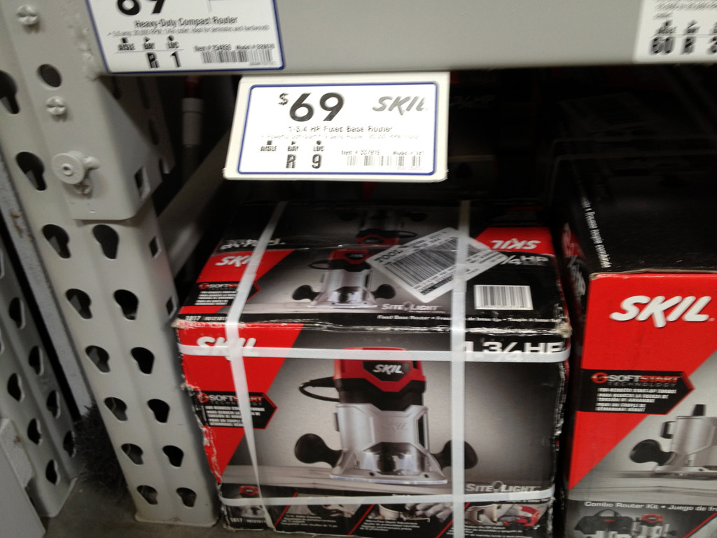 I borrowed my brother’s router table back in June of 2012 to build the hall tree.  It is a beginner’s Ryobi table.  You can pick them up for $99 at Home Depot and it comes with a router.  He moved a couple of moths later and I asked him if he wanted me to bring it with me when I helped him move and he said no.  I then offered to bring it at Christmas and he said no.  He’s come to my house a few times and declined to take it with him.  If I offer to give you your tool back 8 times and you decline then I stop asking.  So last week out of the blue I get a text message asking if I have his router so of course I said yes.  We met for lunch yesterday and he totally forgot that he was supposed to pick it up until I went and took it out of my car.  Long story short, I had to go buy a new router, router table, and router bits.  I was sorely tempted to pick up the $99 table like my brother’s but I think that I have progressed enough in my wookworking skills to warrant a better table.  I have a Lowes and a Home depot both near my house so I went and took a look at both places.  I finally decided on the Ryobi table and router because of price, size, and construction.  The Skil table looks cool but didn’t feel very sturdy because of the folding legs.  The Ryobi table is also much longer which may be good or bad as I might have to build a small table for it.