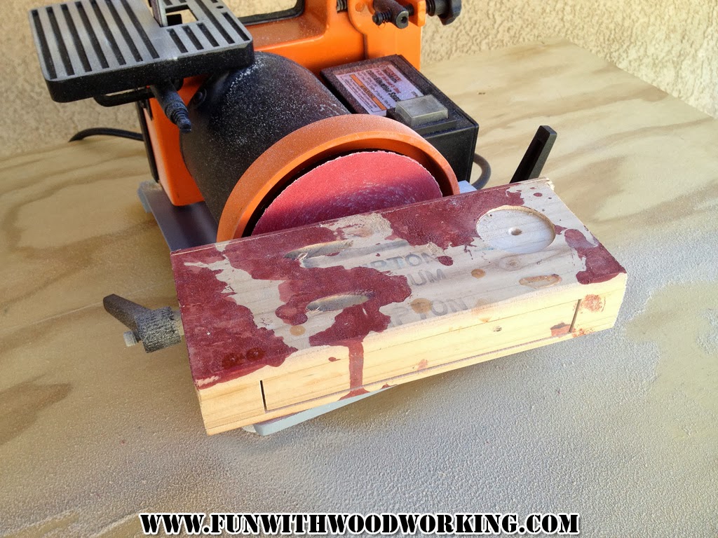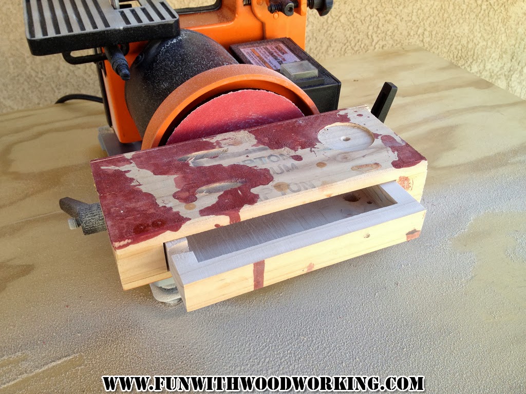 The drawer should have been the same size as those side pieces but was a smidge larger so I sanded it down to size with the disk sander
