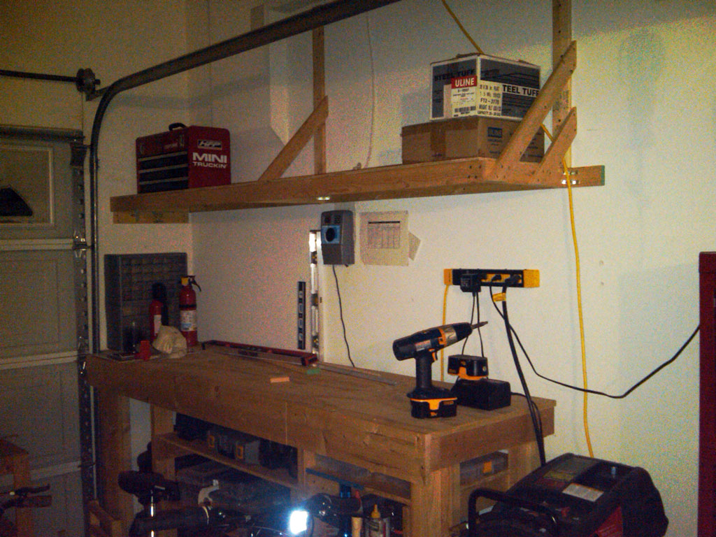I was going through some files on my computer and found a couple of pictures from when I built my first workbench a couple of years ago. I only had a cordless circular saw and a cordless drill at the time and it was my excuse to buy a mitre saw. I had zero woodworking experience and was determined to over engineer the hell out of it. I think that I used 13 – 2×4’s on that one bench. Each leg is made out of 2 pieces of 2×4 that are screwed together in an L shape. I notched each one at the top and bottom by making a bunch of horizontal cuts with the circular saw and then cleaning them out with a chisel.