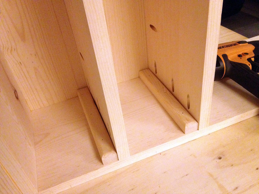 The seat and shelves really warped when I cut down the 1×10 to size so now the dividers don’t fit correctly. They are sitting on the crown in the middle and don’t touch at the front or back so I decided to glue and tack in some supports on the sides. I am using the dividers since they are sanded down to 120 grit like everything else. I am going to sand one more of them to 220 grit to test more staining. When I stained the step stool it was only sanded to 120 and I was really happy with the way it turned out.