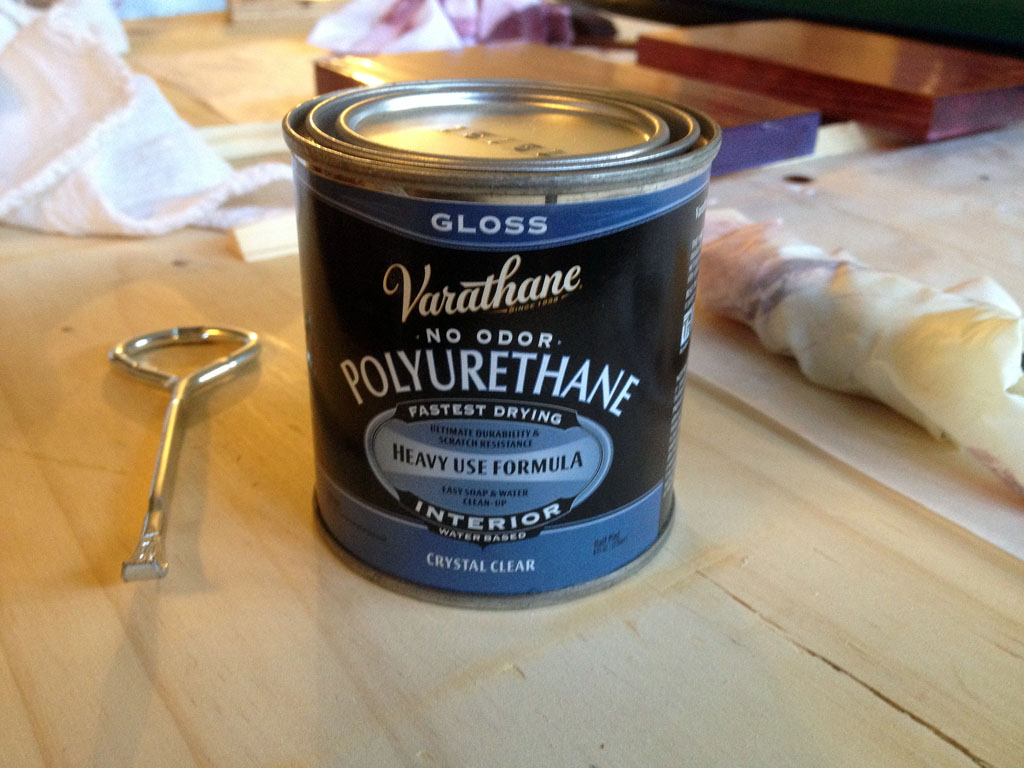 As I mentioned in my previous post I bought some new stain so I tried it out last night. I bought a couple of little cans of polyurethane when I did my first ever stain and poly job on my son’s step stool. I have a little can of Minwax Oil-Modified poly that I used on the step stool and a Varathane water based poly. Since I am using a water based stain I figured that I would try the water based poly too.