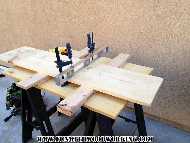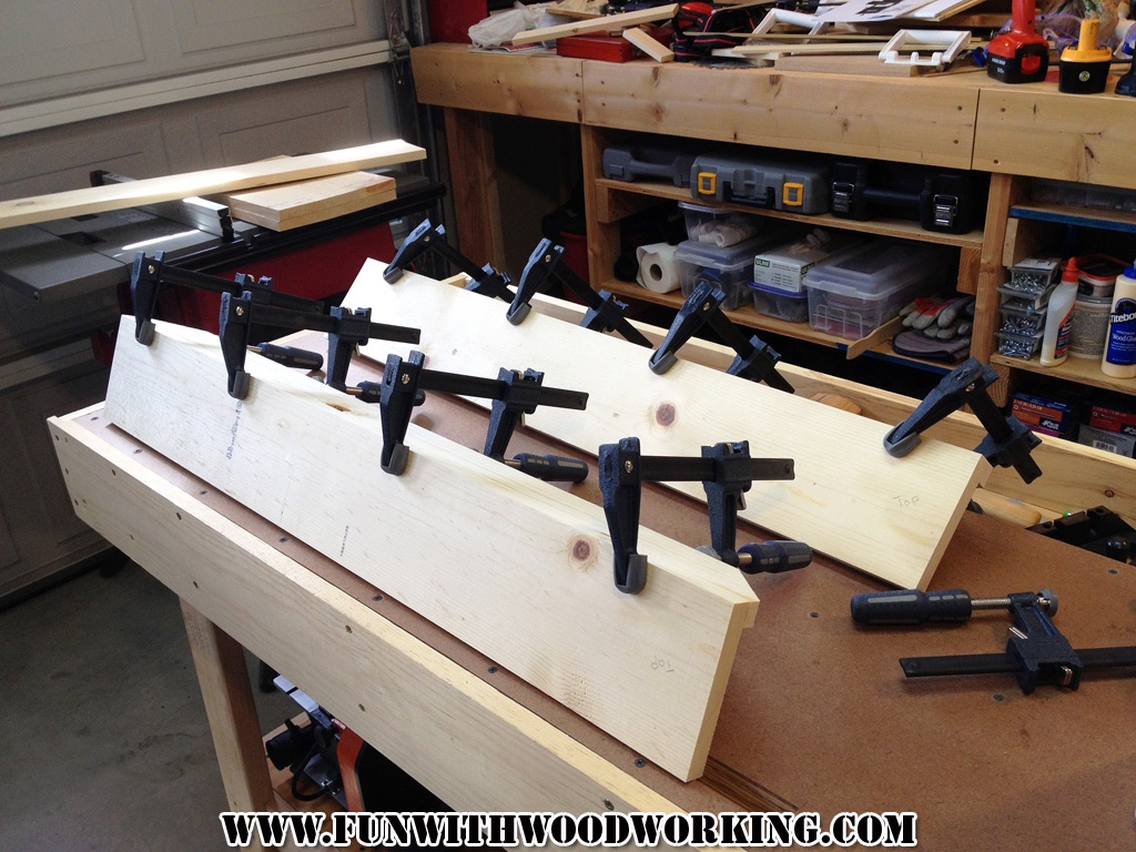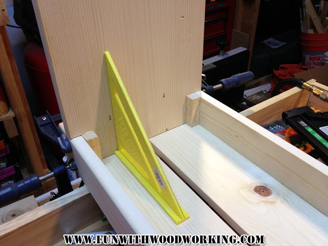 I glued the legs to the top/apron pieces and then made sure that they were square before clamping them up.