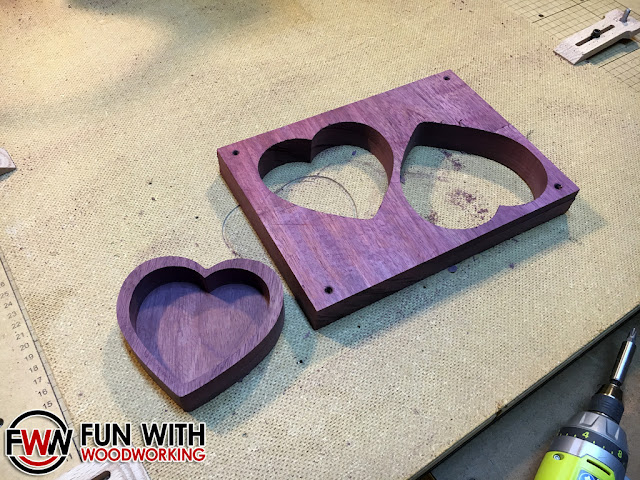 The base on the left is cut similar except that center is cut down to 0.850" for the tray. The other hearts are there to level the lip and cut the outside of the heart.