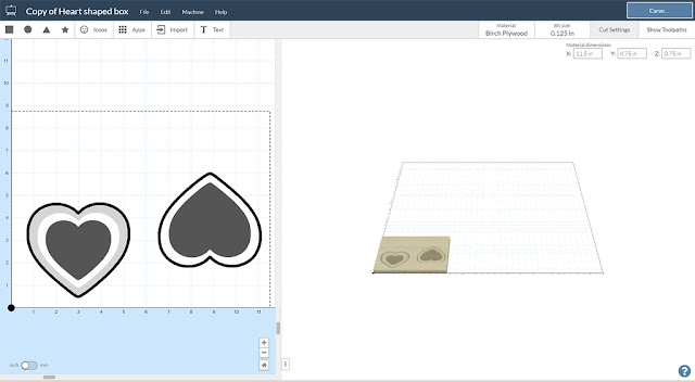 I have an X-Carve CNC machine so my next step was to design a box using the free Easel software on the Inventables website. They had a heart shape already in the software so I made the lid by nesting 3 hearts on top of each and the base by nesting 4. The lid is on the right and the base is on the left. The center heart of the lid is set to 0.025" to level out the wood. The white part around it is set to 0.125" (1/8") to create the lip. The black outline is set to 1/2" to cut the outline of the heart.