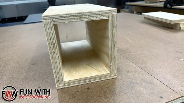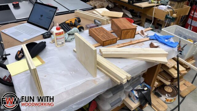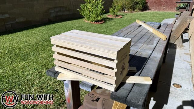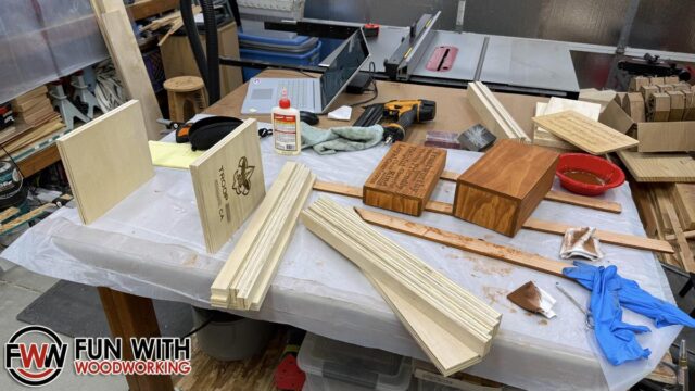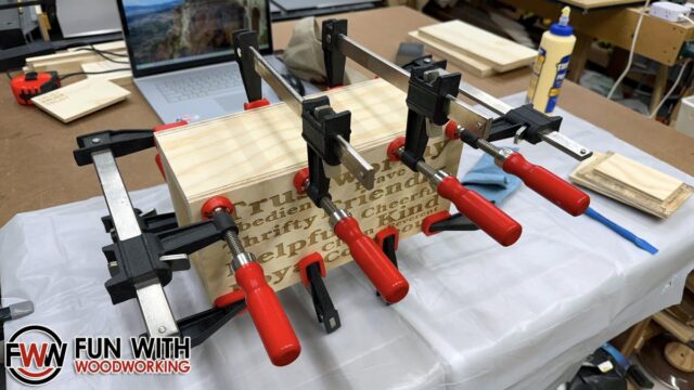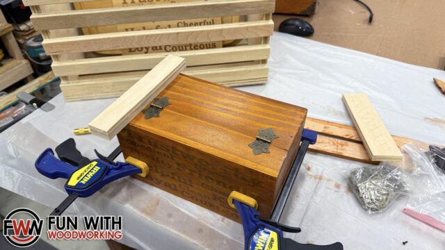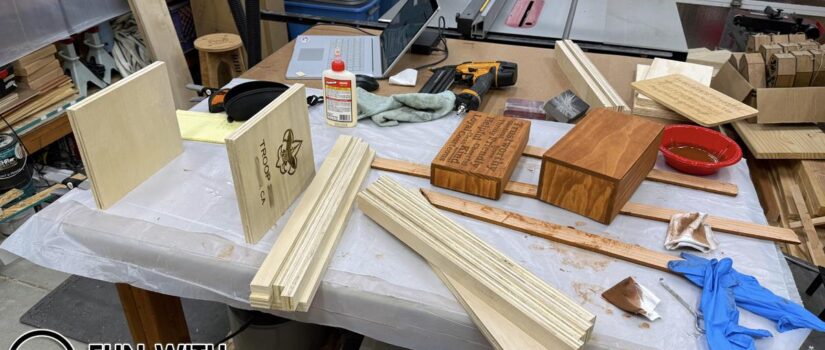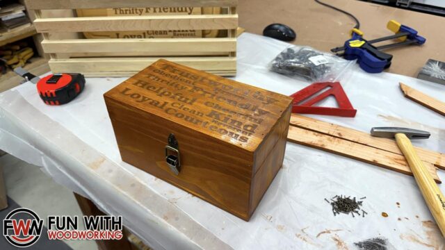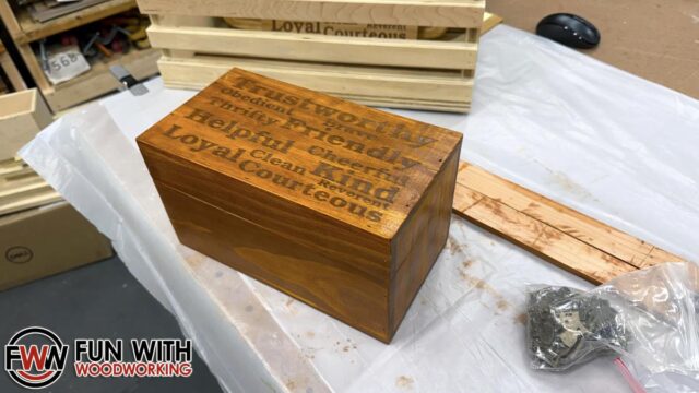 While I was working on the box, I had the laser engraver working in the background engraving cutting boards. While the glue was drying, I cut a bunch of scrap plywood down into 1 1/2″ x 3/4″ by 18″ strips. I had 2 larger pieces of scrap 3/4″ plywood that were the same size (around 10″ x 8″ I think) so I laser engraved the Eagle Scout logo and Troop number and city name on the sides and then built everything into a crate.