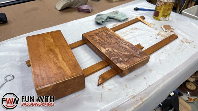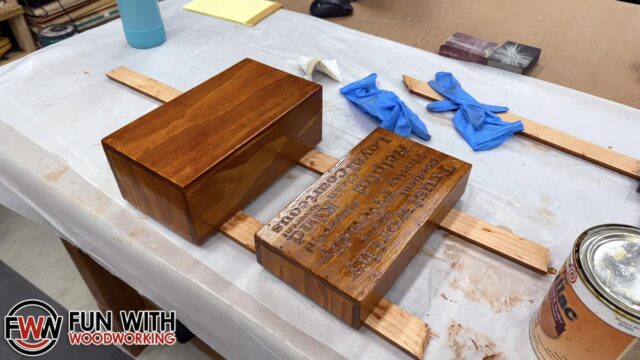 I got out to the shop about 11:00 am on Saturday morning and decided that I was not going to use this box. I dug around in my scrap piles (plural) and found 2 – 5 1/2″ x 24″ x 3/8″ boards that I had bought 6 months ago for a project that I never made. I designed up a quick box in Sketchup using those material dimensions, and came up with a 10″ x 5 1/2″ x 5 3/4″ box. I cut the wood down to size, laser engraved the top, and then glued it together using butt joints and 1″ brad nails. I let it dry for an hour, sanded everything flush, cut off the lid and then stained it with the last of my Gunstock stain.