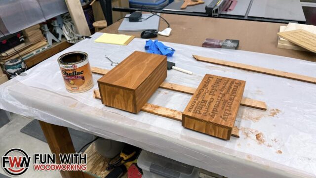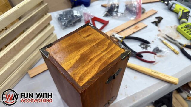 I glued it all up and let it dry overnight. The next day, I cut the lid off on the table saw and then stained the entire box. I was planning on giving it an amber shellac finish but had very little left in the can so I used a beeswax and oil finish instead. That ended up being a very bad idea. The stain was rubbing off while I was applying the finish and it ended up looking splotchy and uninspired.