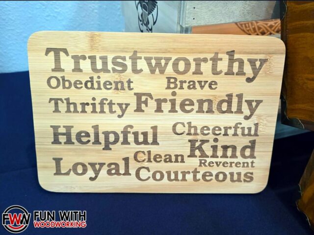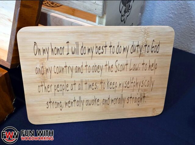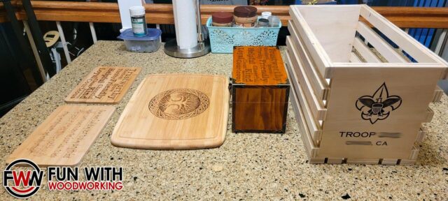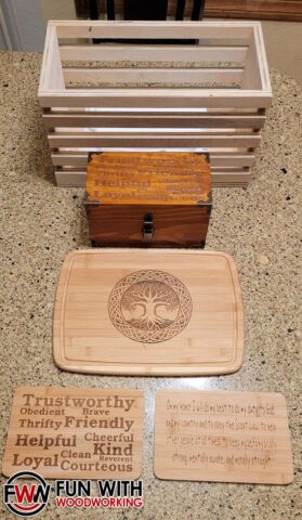 At the Fall COH for our Boy Scout Troop, we serve lunch and raffle off gift baskets of items donated by member families. I always build some kind of woodworking gift package. This year, it was a custom made laser engraved box, a laser engraved crate, and 3 laser engraved cutting boards.
