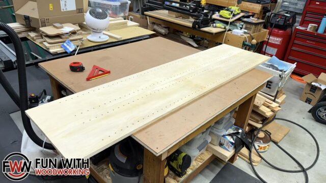 My son works at a local grocery store and attends college full time so we don’t get to work on his new shelf unit as often as we like but we managed to get some braces installed, holes drilled, and started the final sanding to prep them for paint.