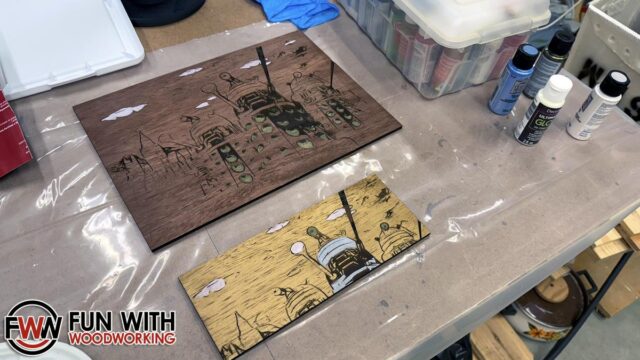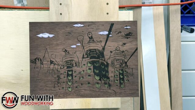 I like the way that the clouds and the green turned out but the blue on the Dalek on the left looks too close to the color of the clouds. I’m going to pick up some more colors and experiment some more on the other Daleks.