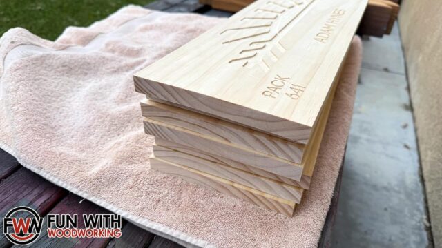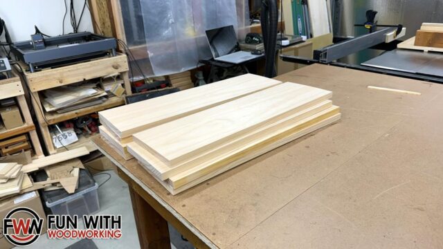 I picked up 2 – 8 ft boards of 1 x 8 clear pine from Lowes and cut them down into 8 – 2 foot lengths using my cross cut sled on the table saw.