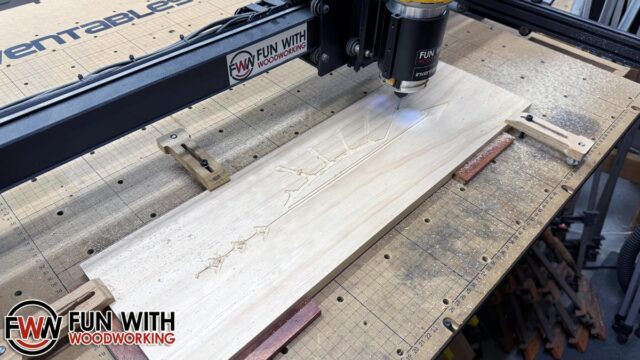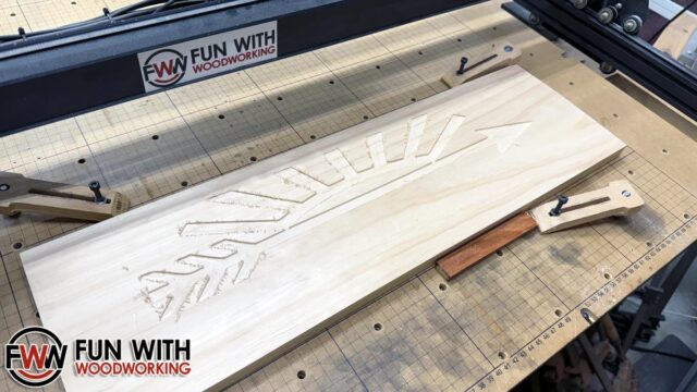Once they were all cut down to size, I engraved an arrow in each one using a 1/8″ bit on my CNC machine. Each arrow took about 30 minutes to carve out.`