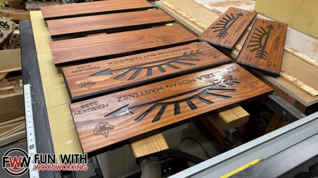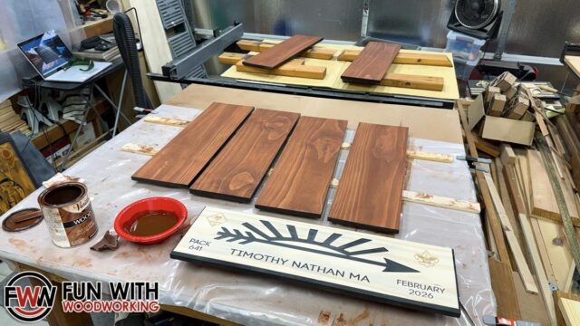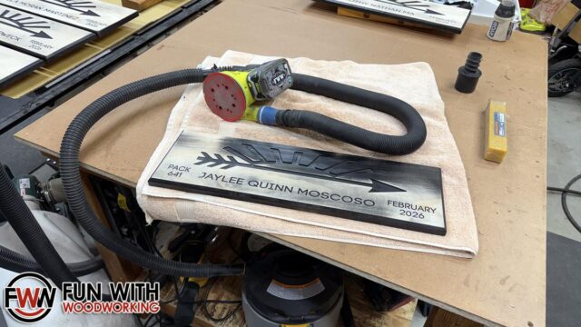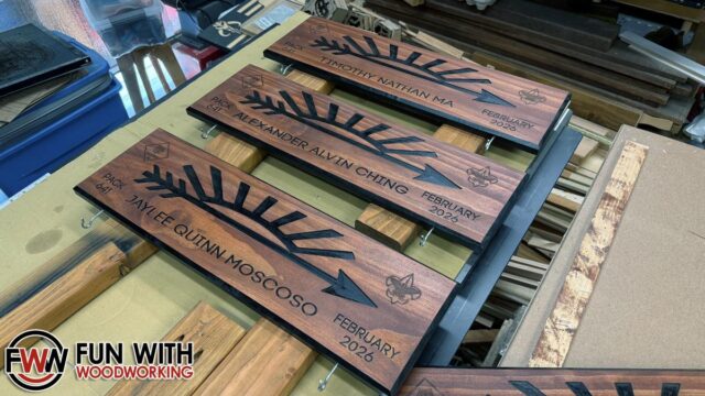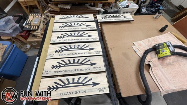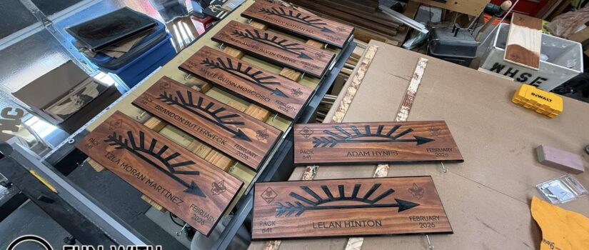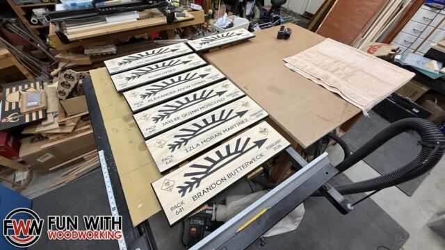 Once they were smooth, I engraved the cub scout and BSA logos on a test board and then the final boards using my laser engraver. I gave them another quick sanding to eliminate any scorching left by the laser.