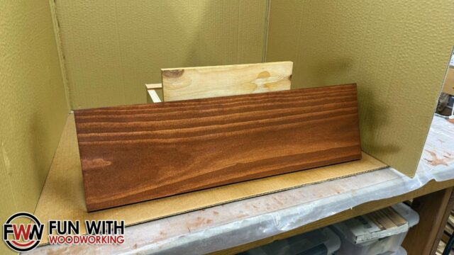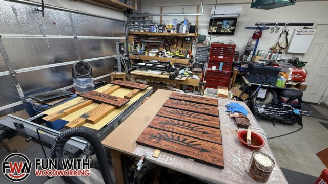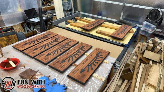 I let the stain dry overnight and then built a small paint booth in the shop so I could give the plaques 2 coats of clear on the back and 3 coats on the front. It was really cold outside, mid 40’s, and the spray lacquer does not like the cold.