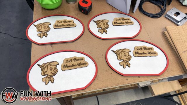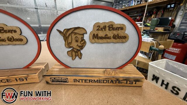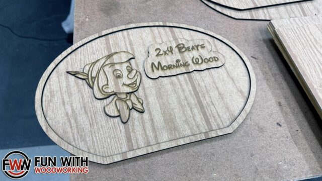 A friend of mine races dirt bikes and one of the classes that he runs is named “2×4”. It was his turn to supply trophies so commissioned me to make them for him. He came up with the idea of Pinocchio saying a certain phrase so I designed up a trophy for him. It is based on a 2 layer plaque being inset into a piece of 2×4 wood.