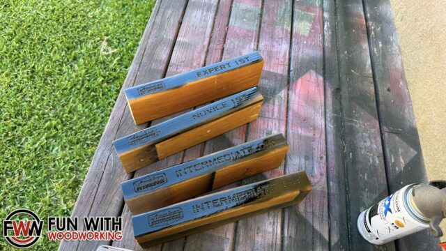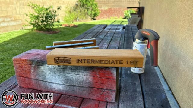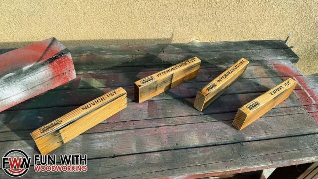 I cut pieces of 2×4 wood down to 12″ and laser engraved the classes onto the front of each one along with the logo of the club that hosts the event.