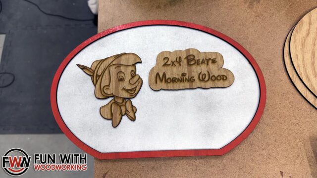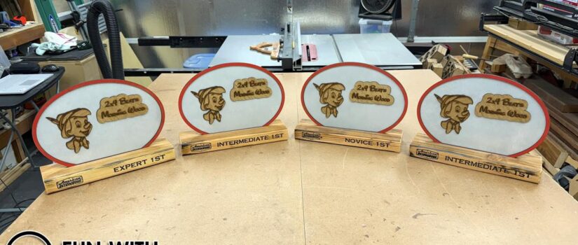 A friend of mine races dirt bikes and one of the classes that he runs is named “2×4”. It was his turn to supply trophies so commissioned me to make them for him. He came up with the idea of Pinocchio saying a certain phrase so I designed up a trophy for him. It is based on a 2 layer plaque being inset into a piece of 2×4 wood.