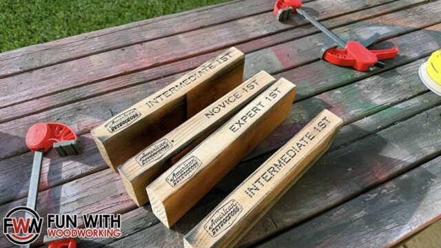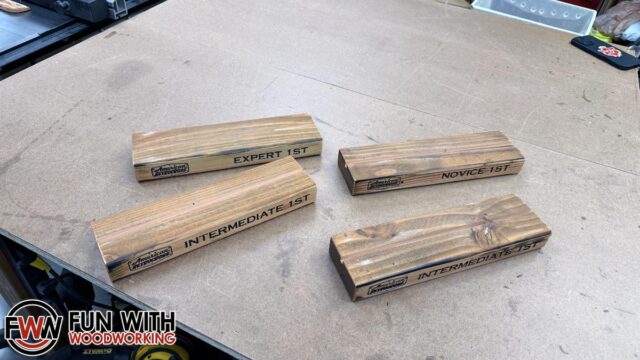 I cut pieces of 2×4 wood down to 12″ and laser engraved the classes onto the front of each one along with the logo of the club that hosts the event.