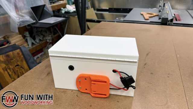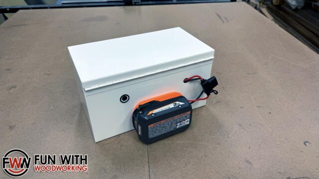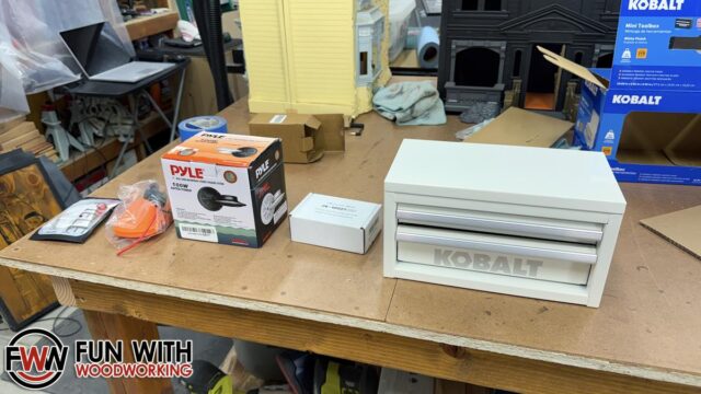 I picked up a toolbox from Lowes, and the rest from Amazon. A 200 watt 2 channel amp, a latching push button switch, a power adaptor for Ridgid batteries, and a set of 4″ speakers.