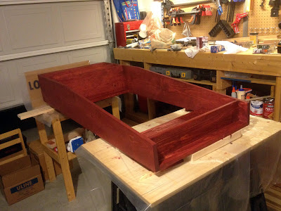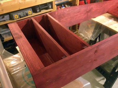 The hall tree has been stained! Saturday morning I sanded down the back piece that goes under the top shelf and then glued and screwed it in place. I had to drive out of town for my nephew’s birthday party and by the time we got home and got everybody in bed and I got out to the garage it was 11:15 pm. I turned on the radio and the fan and got started. I wore latex gloves and used 1 lint free cloth to rub in the stain and another to wipe it smooth. When I was finished and looked up at the clock it was 1:00 am. I guess I was just in the zone. Next time I think I will use a small foam brush to get the inside corners and edges where 2 boards meet. I am also going to buy some heavier duty gloves. I tore out the end of the index finger on my right had 3 times. I plan on putting the 1st coat of polyurethane on tonight and have no idea how I am going to do it. Wish me luck!